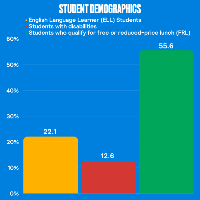 - Percentage of students who qualify for free or reduced-price lunch (FRL): 55.6%