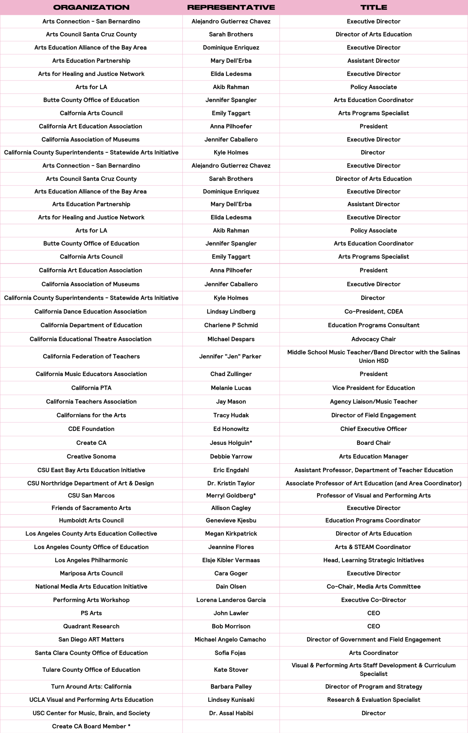Create CA’s Policy Council is composed of allied partners from education, business, arts and parent organizations. Working in conjunction with the Board of Directors, the Policy Council builds a state-wide policy agenda and common understanding to collectively address the systemic challenges and opportunities for equitable access to high-quality arts education for all California public school students.